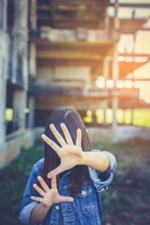 Woman bondage in angle of abandoned building image blur , stop violence against Women, international women's day