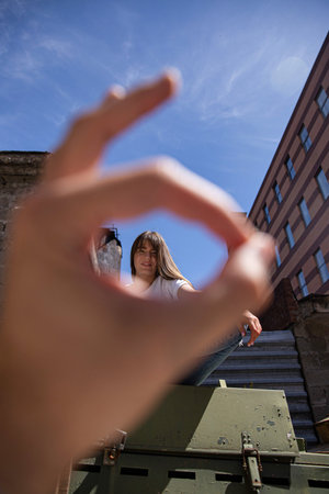 Young european girl with straight hair with sky behind with hand in front