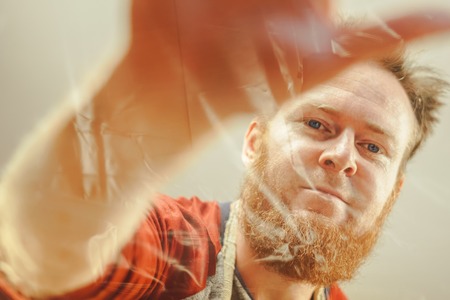 Blurred viewpoint. Closeup of a thoughtful young man seen through a window.