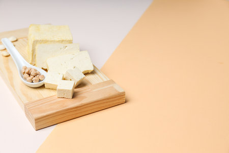 Fresh tofu on cutting wooden board, Vegan food ingredient in Asian cuisine, Plant based diet