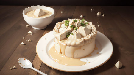 Vegan silken tofu on white plate for healthy menu.