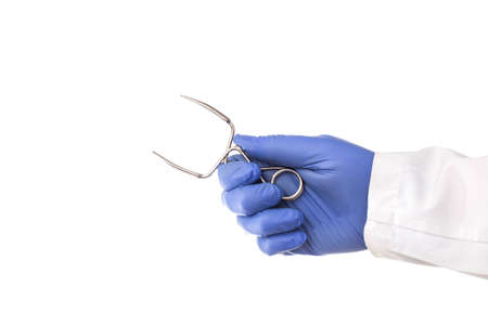 Doctor in a medical glove holds a surgical scissors on a white background, isolate. Close-up, veterinarian