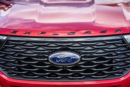Ulyanovsk, Russia - September 23, 2018: Closeup detail photo of Ford logo on the hood of the car Ford Explorer. Shallow focus.