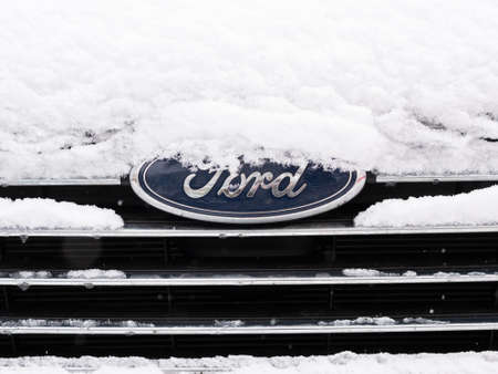 BERLIN, GERMANY - JANUARY 30, 2021: Close-up of A Snow-capped Ford Logo On A Car In Berlin, Germany