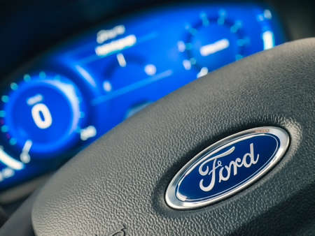 Galati, Romania - September 05, 2020: Focus on Ford logo on steering wheel, out of focus of the dashboard, speedometer and tachometer. Modern car interior