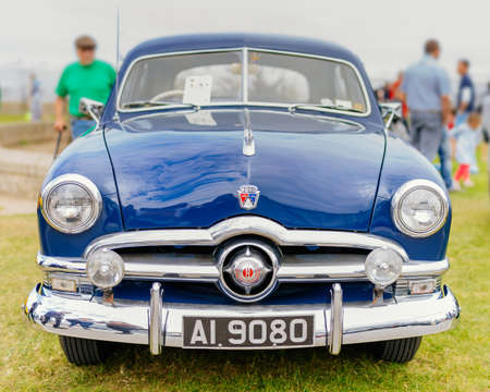 Bray, Ireland, June 2018 Bray Vintage Car Club show, open air retro cars display. Front view on blue Ford Custom Deluxe Fordor Sedan from 1950s