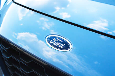 Kharkov, Ukraine - September 13, 2021: Ford brand logo on a blue car background, emblem, symbol close-up