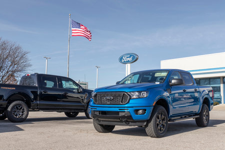Lafayette - Circa December 2021: Ford Ranger and F-150 pickup trucks on display at a dealership. Ford F-Series pickup trucks are the best selling models in the US.