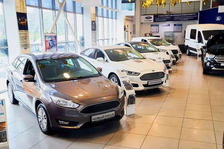 Murmansk, Russia - June 21, 2019: Cars in showroom of dealership Ford in Murmansk city in Russia