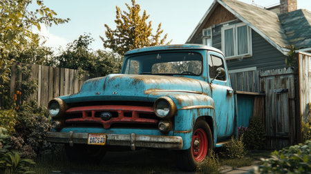A vintage blue Ford truck is parked in front of an old house with a wooden fence. The car has red wheels and is very well-maintained. There is some greenery around it, and the background shows clear skies. The photo was taken with a Sony Alpha A7 III camera, in the style of Sony. --chaos 30 --ar 16:9 --v 6.1 Job ID: d6524f69-d5f0-469f-8bf1-ac7712533b89