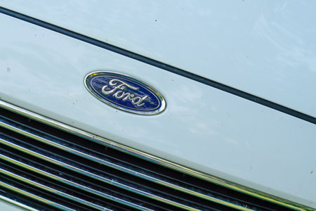 Tallinn / Estonia - Mai 1, 2021: Close up of old and damaged Ford emblem on the grill. Economy class car accessories and design elements. Close-up image. American car