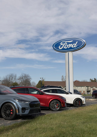 Logansport - November 11, 2023: Ford Mach-E Mustang SUV display. Ford offers the Mach-E in Select, Premium, or GT models.