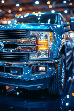 Rugged Truck s Shiny Grille with Vibrant Showroom Lights Reflections and Bokeh, Space for Text
