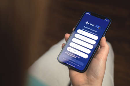 Kharkov, Ukraine - January 10, 2022: Woman uses GHA CVOID-19 Giblartar app. Hand with Apple iPhone 12, mobile phone screen with logo