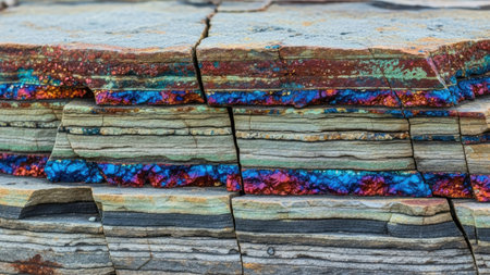 Showing colorful layered rock formations showing geological strata and sediments keywords: geology, rock, layers, strata, colorful,...