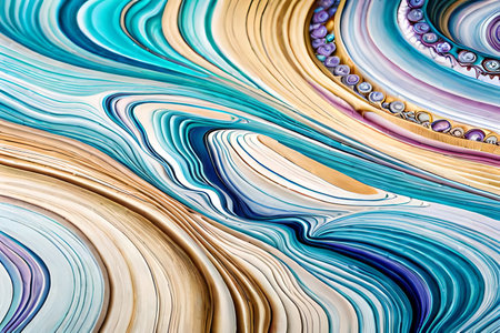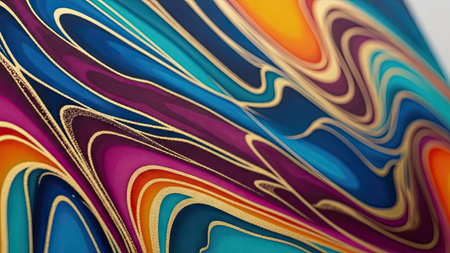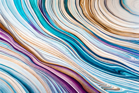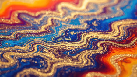 Abstract swirling marbling of glittering blue, green, purple, and gold liquids creating a vibrant, textured...