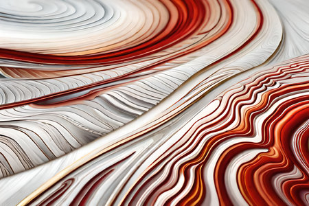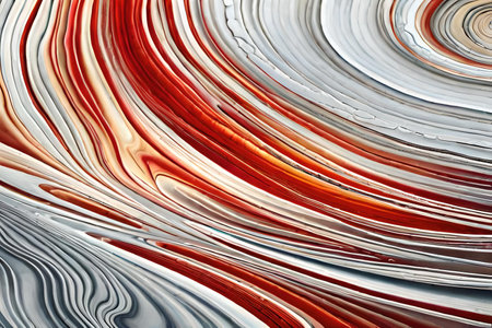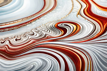 A close-up view of an abstract marbling effect featuring flowing lines of red white and blue paint creating a unique textured background