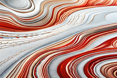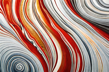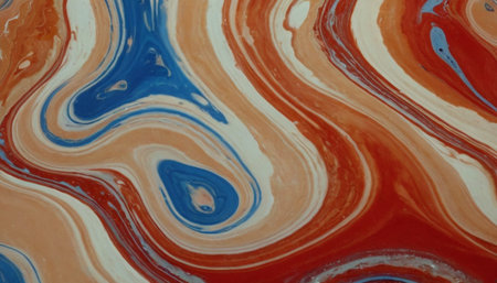 presents a detailed close-up of an abstract marbling technique, featuring a vibrant mix of red, white, cream, and blue paints. The fluid, organic lines create a sense of flowing movement and intricate patterns. The colors are distinct yet harmoniously blended, forming a visually appealing texture. This abstract is use as a background, or any application requiring a touch of creative and dynamic visual interest.