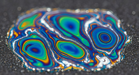 A mesmerizing abstract macro photo captures a thin, iridescent film of liquid on a dark, granular surface. The light interference creates beautiful, flowing, topographic-like patterns in vibrant shades of blue, green, and orange.