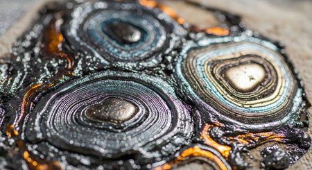 An extreme macro photograph of a unique, abstract texture formed by hardened molten material, possibly metal or resin. The iridescent surface features concentric, layered rings and a rough, metallic sheen. This image creates a compelling industrial or geological background.
