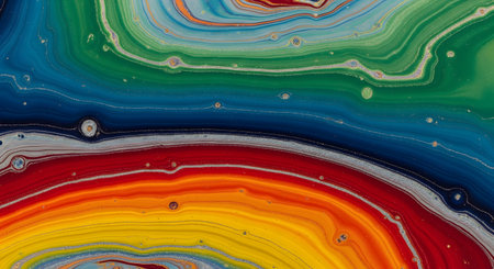An abstract background of vibrant, flowing colors resembling a cross-section of an agate stone or liquid art. The pattern features glittery bands of rainbow colors—red, orange, yellow, green, and blue—creating a dynamic and colorful texture.