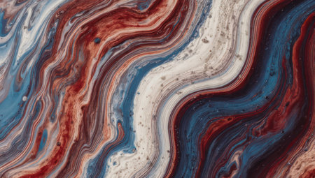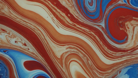 A detailed abstract showcasing the marbling technique with a rich combination of red, white, blue, and brown colors. The paints are mixed in a fluid manner, creating intricate, flowing patterns and organic curves that give the a sense of depth and movement. The surface is smooth and glossy, highlighting the vibrant colors and the unique textures formed by the swirling liquids. is a testament to the beauty of abstract liquid