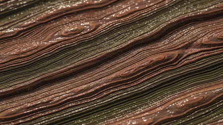 A macro abstract view of wet wood grain rippling lines and swirling patterns in rich brown and green hues.