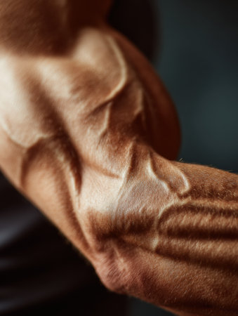 Close-up view of a muscular arm under tension, highlighting defined veins and muscle contours in a workout setting, capturing strength and dedication.