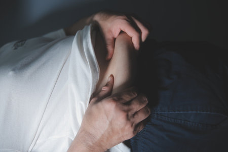 Young man with pain in shoulder, Ache in human body, office syndrome, Concept healthcare and medical
