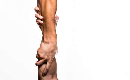 Rescue, helping gesture or hands. Two hands, helping arm of a friend, teamwork. Helping hand outstretched. Friendly handshake, friends greeting, teamwork, friendship