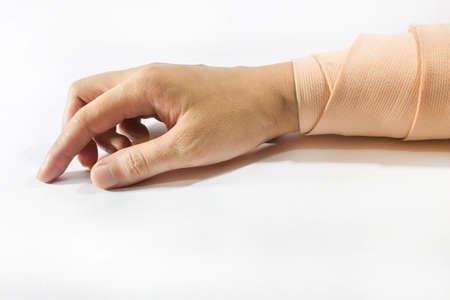 Fractures and dislocations concept. Male hand in white bandage. Helpful medication for painful palm arm of young man.