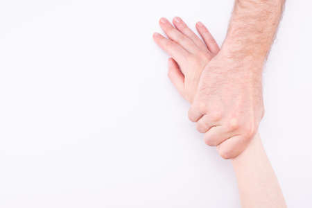 Domestic violence concept. Man pulls a womans hand on a white background