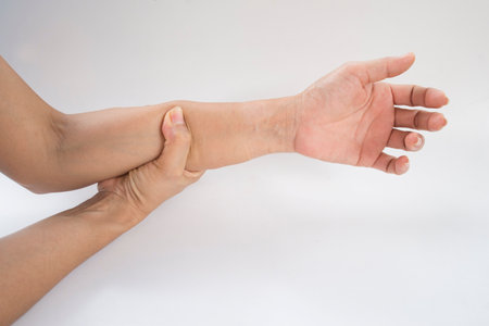 Rheumatism man hand pain from cramp, wrist pain touching massaging, hand holding ache joint