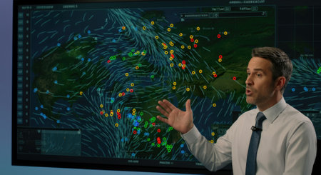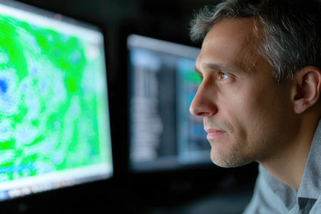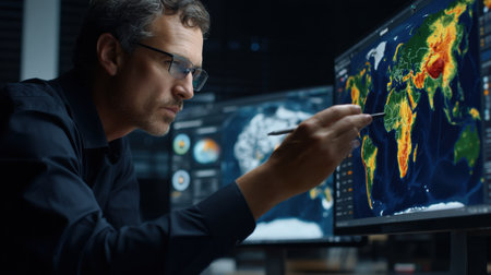 A dedicated meteorologist is focused on analyzing complex weather patterns displayed on a large computer screen in a contemporary office setting.