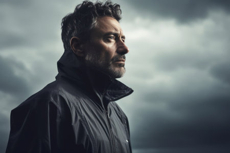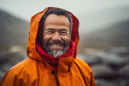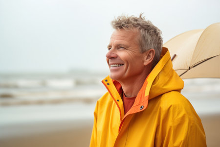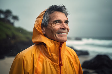 a happy portrait of a man wearing a raincoat. GENERATE AI