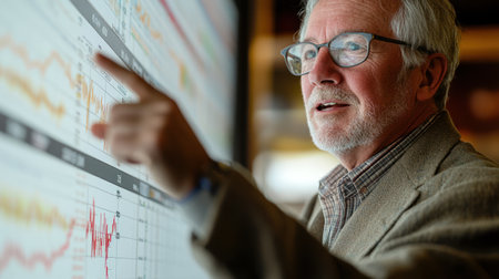 A financial educator pointing at projected gold demand growth on screen with charts and data, showing focus and expertise in finance analysis