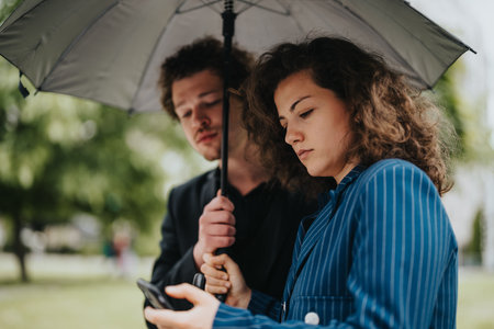 Business colleagues sharing an umbrella while checking a smart phone outdoors on a rainy day