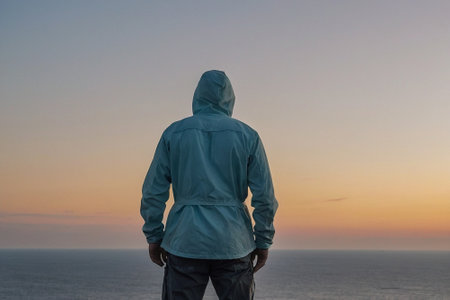 Man in a blue jacket standing on the edge of the cliff at sunset.