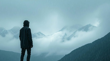 Balancing on the Mountain Trail at Dusk.A lone hiker balances on a rocky mountain trail during early morning or dusk, with a headlamp lighting the misty path.