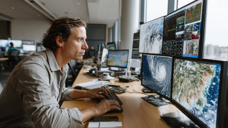 A dedicated meteorologist intensely analyzes weather data and storm patterns using multiple screens in a modern office setting, showcasing advanced technology.