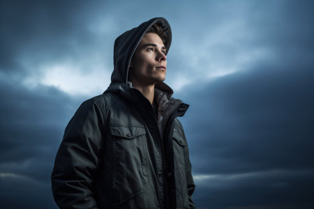 Young man wearing a hoodie looking away with older men in the background, highlighting youth