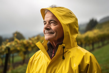Portrait of senior man wearing yellow raincoat in a vineyard