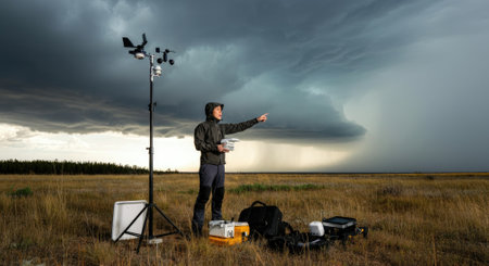 Caucasian male adult using instrument at modern weather station with sensors and anemometers outdoors