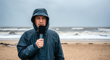 Middle-aged man in raincoat reporting on stormy beach with high waves