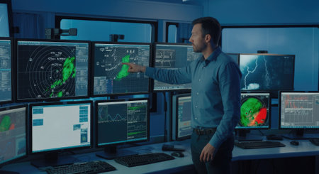 Meteorologist monitoring weather forecast at monitor screen. Workplace in meteorological department. Created with Generative AI