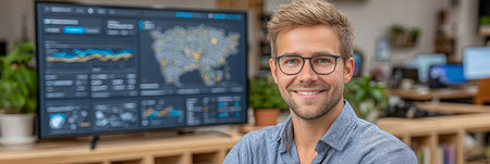 Contemporary Office Environment with Digital Displays Analyzing Global Business Data Insights
