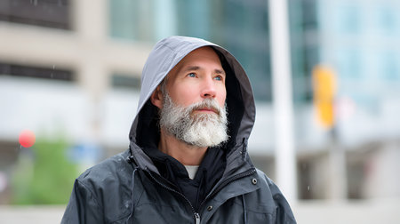 Mature man with long gray beard and mustache wearing black raincoat on urban street