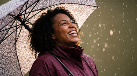 Smiling woman in maroon raincoat enjoying fresh rainfall while holding umbrella and looking up at the sky with joyful expression.