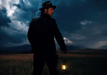 Man in victorian cowboy clothing with lantern standing on prairie area. Side view.