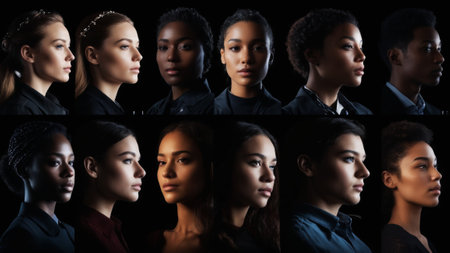 A captivating arrangement of women in profile, each exuding unique beauty and confidence. The dark background enhances their features, celebrating diversity and strength in unity.
